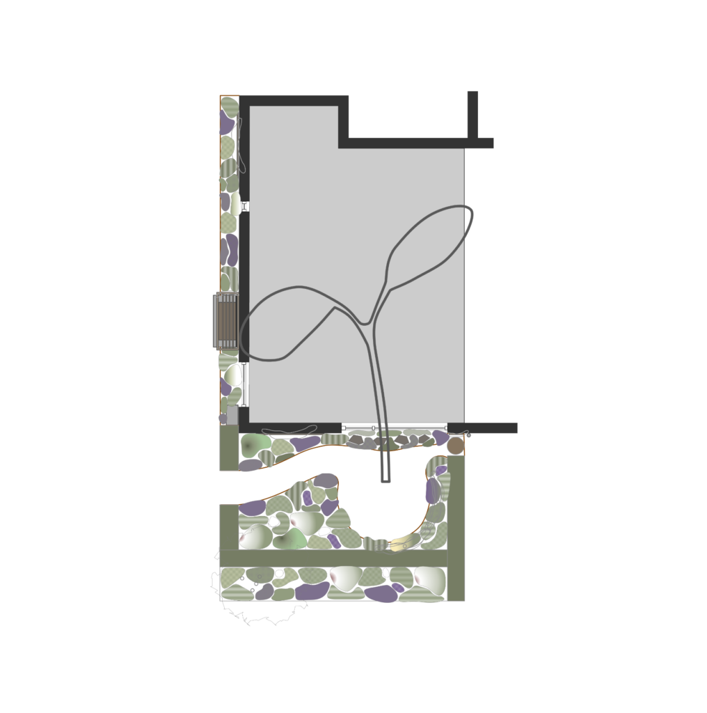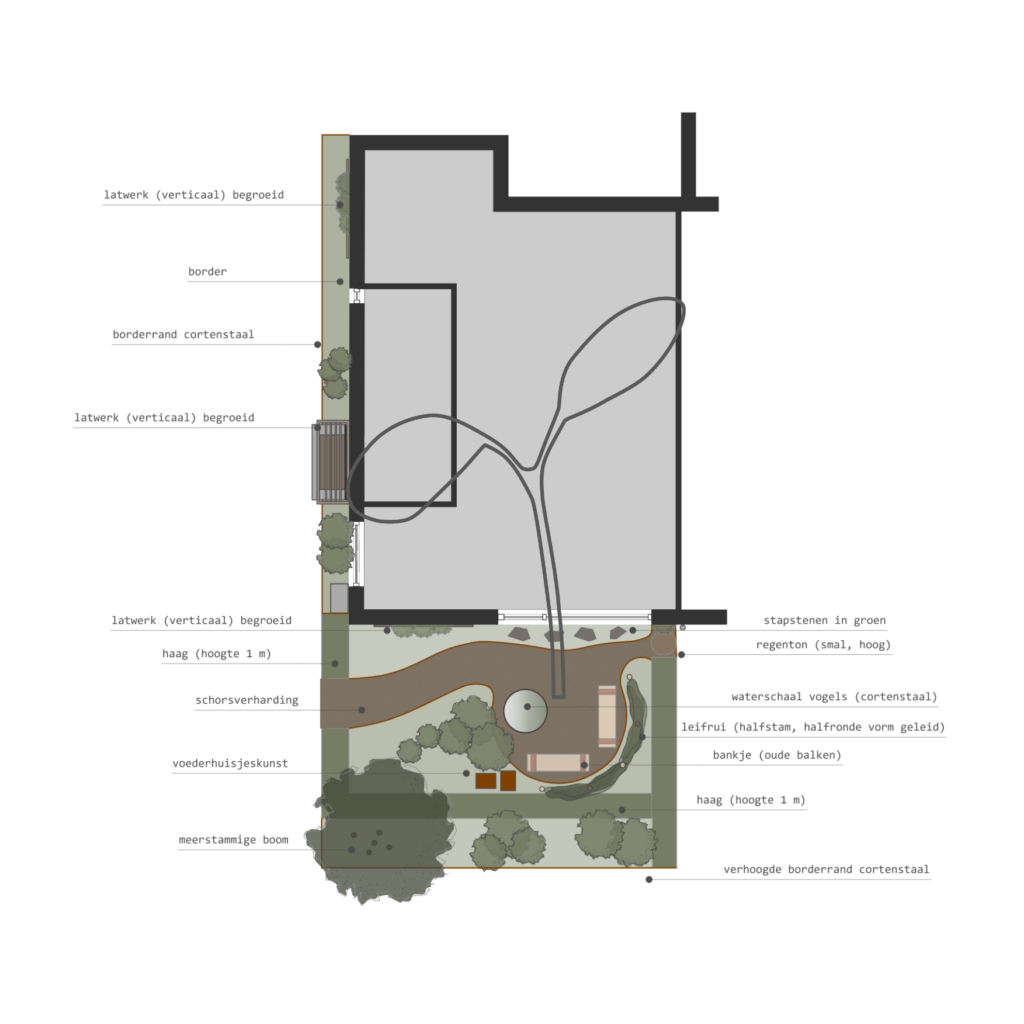 De beplanting zal uit groepsbeplanting bestaan, herhalende heesters, eetbaar kleinfruit en vaste planten wisselen elkaar af. Een meerstammige krent vervult een prominente rol. Kortom: een voortuin die zich in de straat onderscheidt in zowel het gebruik als de vorm.